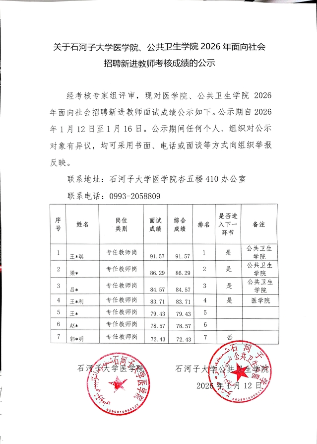 关于欧美色情 、公共卫生学院2026年面向社会招聘新进教师考核成绩的公示
